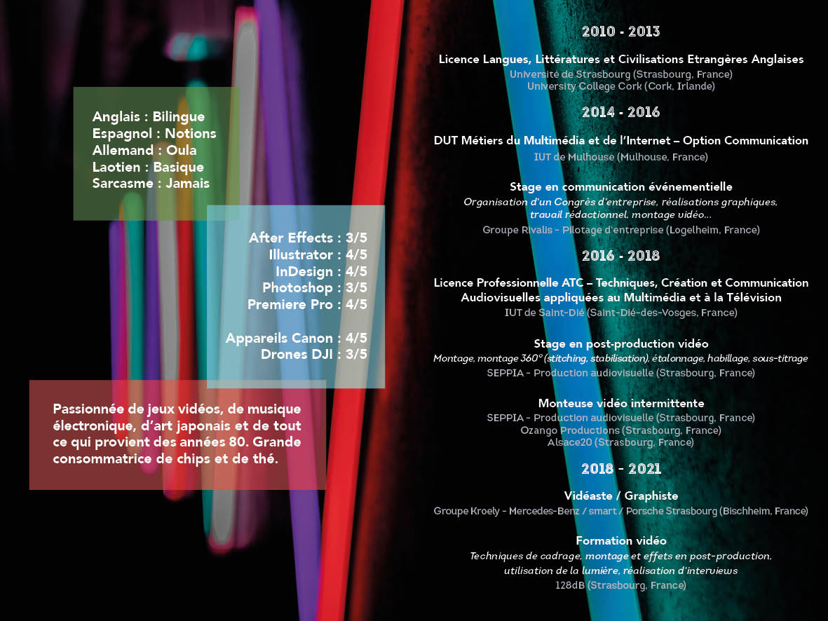 Issue d'une formation en Métiers du Multimédia, j'ai décidé de perfectionner mes compétences audiovisuelles en intégrant une Licence Activités et Techniques de Communication à l'IUT de Saint-Dié-des-Vosges. J'ai eu l'opportunité, depuis, d'appliquer ce que j'avais appris à l'école (et bien plus encore) dans le cadre professionnel.
